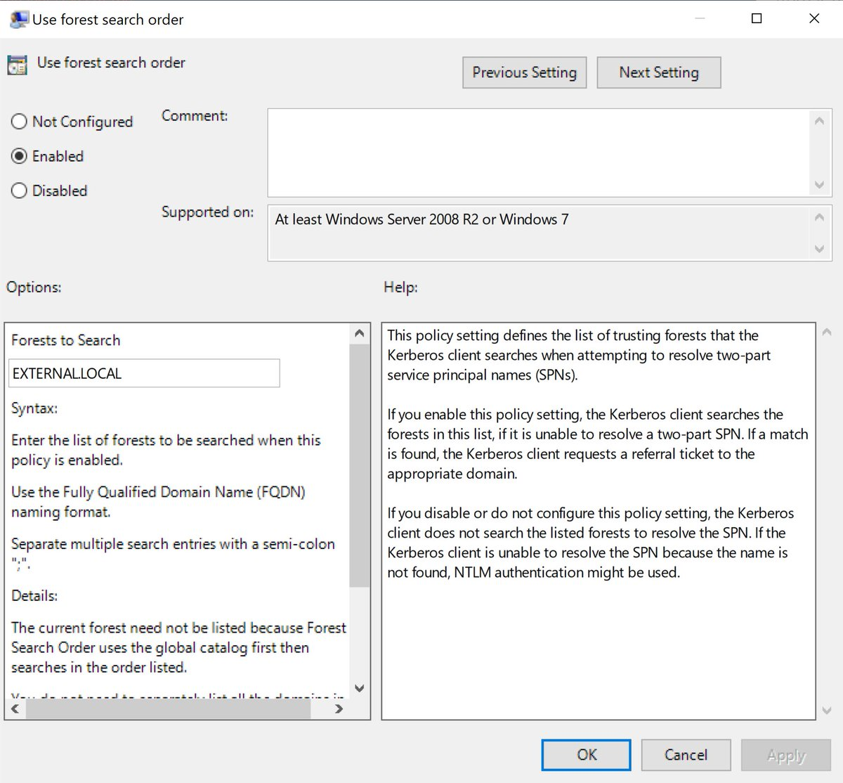 Administrators can enable Kerberos authentication across external trusts by adding the name of the other domain to the Use forest search order policy setting on Domain Controllers.