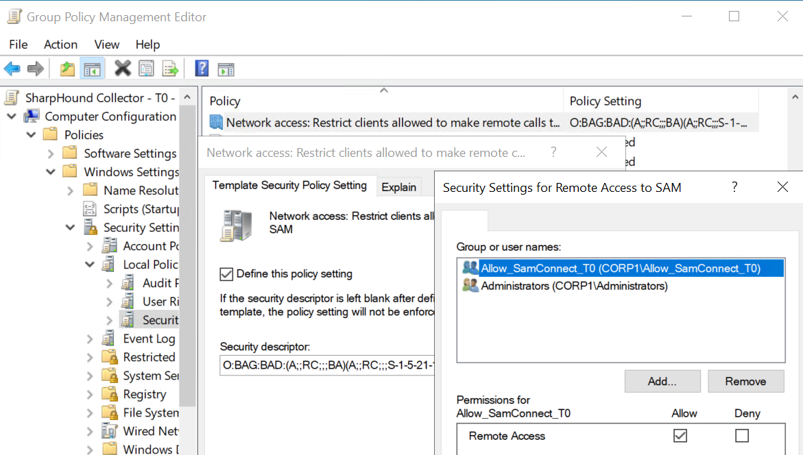 For example, if our Tier Zero SharpHound collector gMSA is a member of the Allow_SamConnect_T0 group, a GPO configured like this and linked to the Tier Zero OU where all of the non-DC Tier Zero assets are located, SharpHound will be able to collect Local Group data from those hosts.