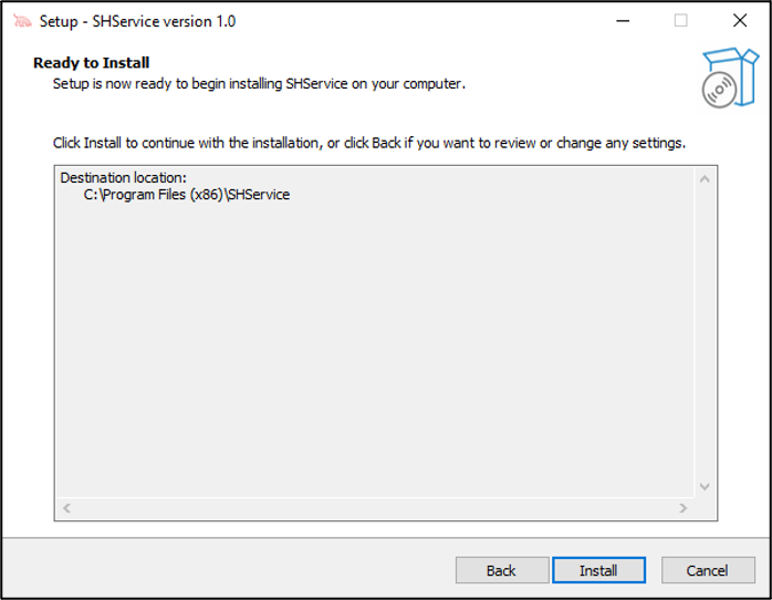 - Choose where to install the service and click Next. We recommend a path protected from low-privileged user writes such as the default “C:\Program Files (x86)\SHService”.