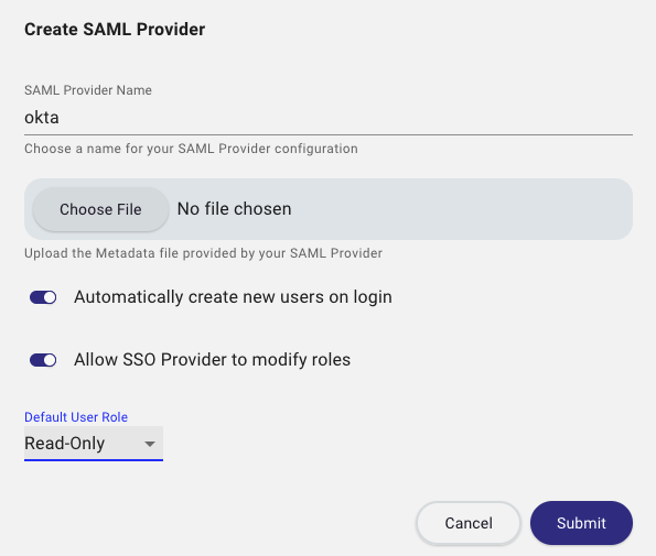 - Give the provider the name you used in the ACS URL (‘okta’ in this example) and upload the metadata.xml you created previously. Click “Submit.”